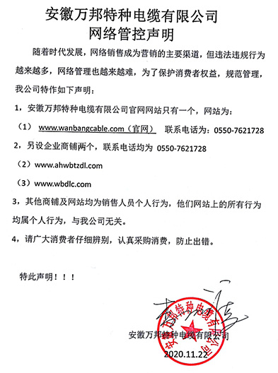鄭重聲明:安徽萬邦特種電纜有限公司官方網站為:www_wanbangcable_com.3m177.com,除此之外無任何子網站或合作網站,其余均為假冒偽劣。電話:0550-7621728 13485756353 地 址:安徽省天長市滁州高新技術產業開發區經四路29號
